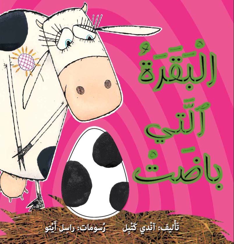 حول العنوان: نقرأ العنوان. نَصِف الرسومات التي على الغلاف، ونسأل الأطفال: هل هنالك ما هو غريب في العنوان؟ ما هو؟ هل تبيض البقرة؟